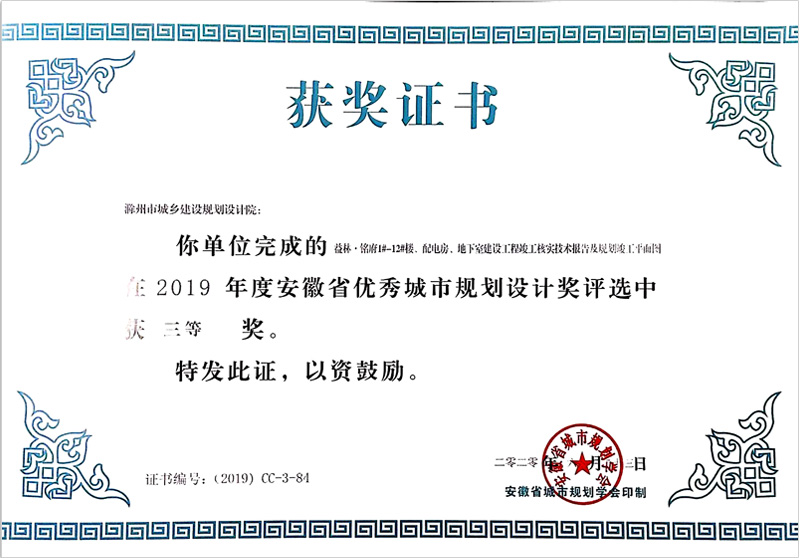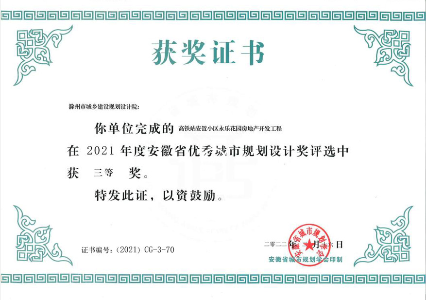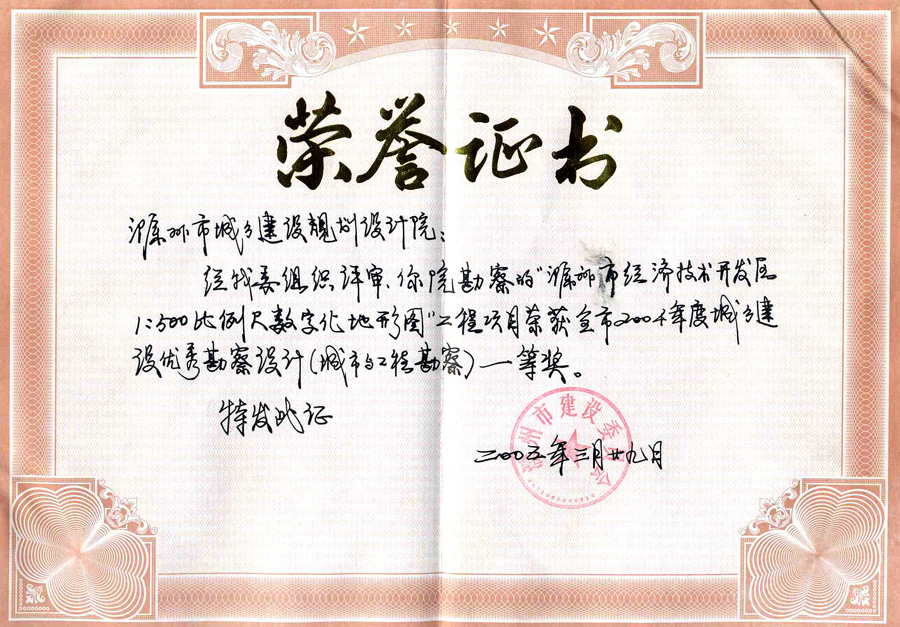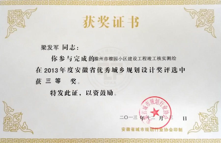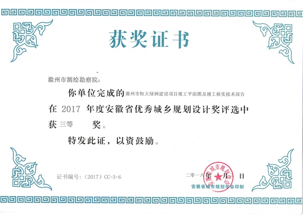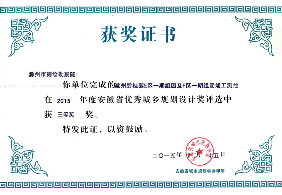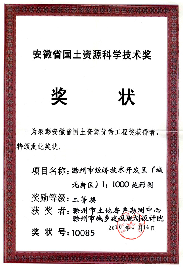 滁州市經(jīng)開區(qū)地形圖測(cè)繪規(guī)劃獲獎(jiǎng)證書