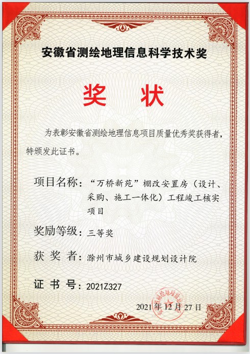 安徽省測(cè)繪地理信息科學(xué)技術(shù)獎(jiǎng)三等獎(jiǎng)